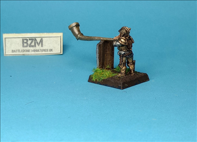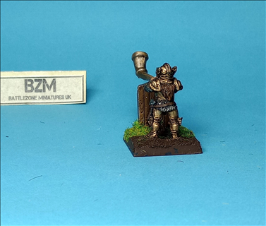 Female dwarf musician with war horn and pavaise.